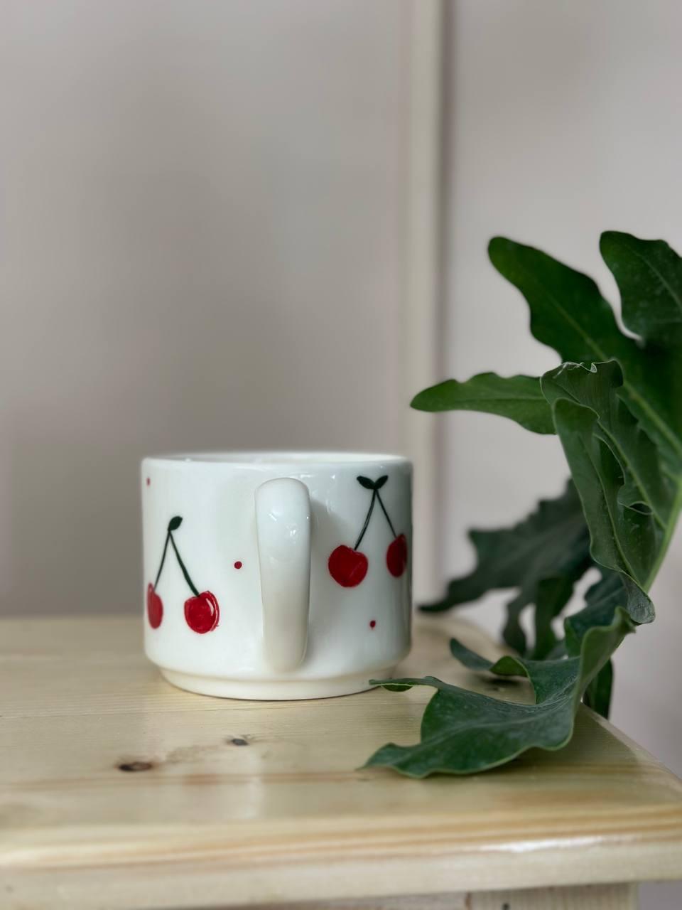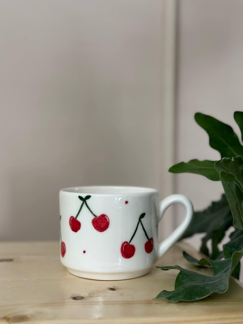 در بیرون این ماگ طرح زیبایی از گیلاس را میشود دید و درون آن هم رنگ بدنه می باشد.