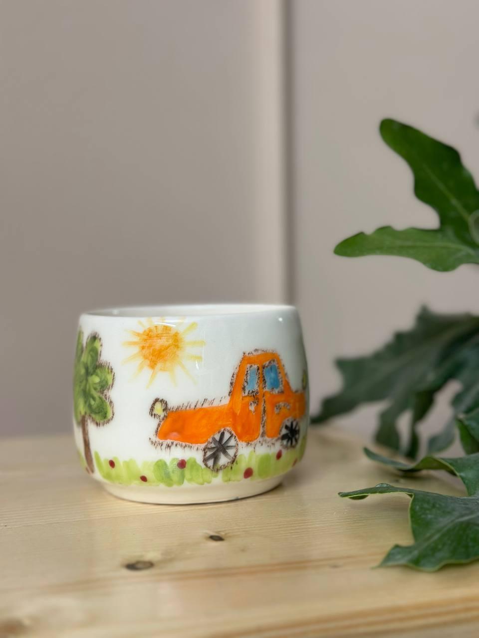 ماگ سرامیکی نقاشی کودک، ماگی با بدنه سفید رنگ طرح کودکانه ماشین و خانه همراه با پسر و دختر می باشد.در بدنه این ماگ ، نقاشی خاص به سبک کودکان با جزئیات و دقت زیادی ترسیم شده است.این ماگ از جمله ماگ های سایز متوسط رو به بزرگ محسوب می شود.
